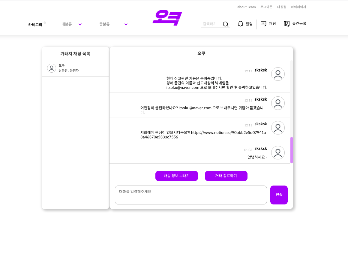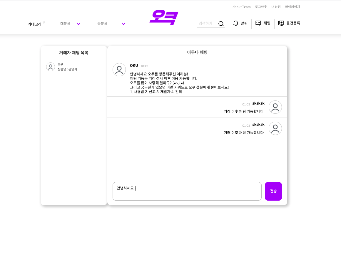 거래 이후 채팅 가능합니다. 또, 오쿠의 경우 안타깝게도 ㅠㅠ 이용 유저가 현재는 없는 사이트여서.